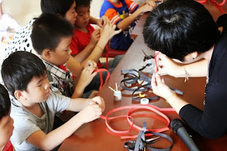 Setiap peserta mendapat bahan workshop, MC.J turut membantu sekaligus latihan jari jemari hihihi |